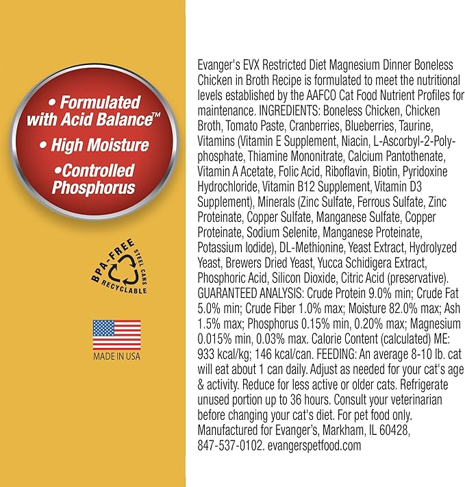 Evanger’s EVX Restricted Diet Magnesium Canned Cat Food – 24 Count, 5.5 oz Cans Each – Boneless Chicken in Broth with Berries – Grain Free, Limited Ingredients, Stew Style
