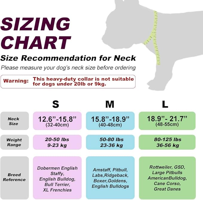 - Metal Collar for Dogs: The dog collars for small dogs with 4 adjustable points, easy to adjust the comfortable fit and attach to dog leash or dog collar. Please follow the size chart to measure your dog carefully before purchasing to ensure the collar is fit well to your dog. For dog neck (L: 18.9”-21.7”, M: 15.8”-18.9”, S: 12.6”-15.8”)