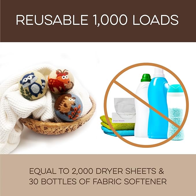 - REUSABLE FOR 1000+ LOADS – REDUCE WASTE: Why keep buying disposable dryer sheets? These cute dryer balls last 1000+ loads, replacing 2000 dryer sheets or 30 bottles of fabric softener. Fluff Ewes dryer wool balls laundry reusable deliver a cost-effective solution for 2-4 years of hassle-free laundry. Make a smarter choice for your wallet and the environment.