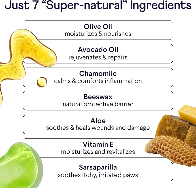 - Only 7 Super-Natural Ingredients - olive oil, avocado oil, chamomile, beeswax, aloe, vitamin E, and sarsaparilla unite to nourish, protect, and repair your pupβs precious paws.