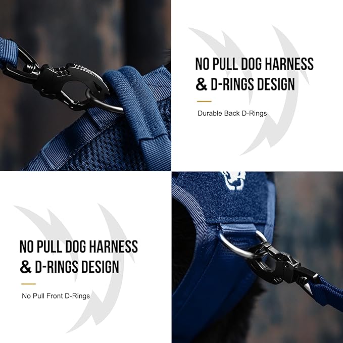 - [No Pull D-ring]: 3 stainless steel D-rings at the front chest and back for training, short and long leashes, with 4 UTX-Duraflex quick-release buckles and 6 fully adjustable straps.