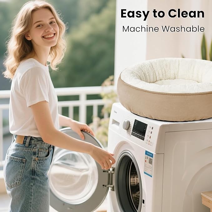 - Donut Cuddler Shape: The round dog bed allows pets to curl up while the raised rim creates a sense of security and provides head and neck support. Premium ultra-soft filling offers joint and muscle pain relief, is a great choice for elderly or sick dog pets. The 25 inch round pet bed is perfect for cat or puppy and other pets up to 30 lbs.