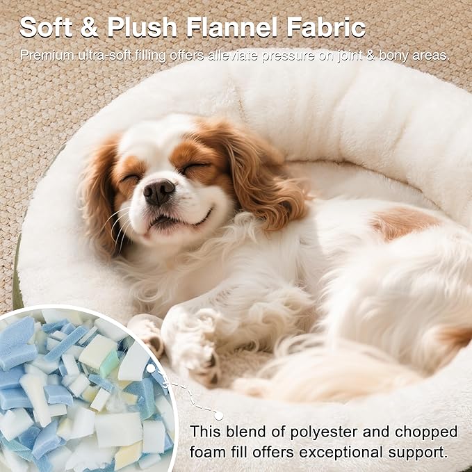 - Donut Cuddler Shape: The round dog bed allows pets to curl up while the raised rim creates a sense of security and provides head and neck support. Premium ultra-soft filling offers joint and muscle pain relief, is a great choice for elderly or sick dog pets. The 25 inch round pet bed is perfect for cat or puppy and other pets up to 30 lbs.