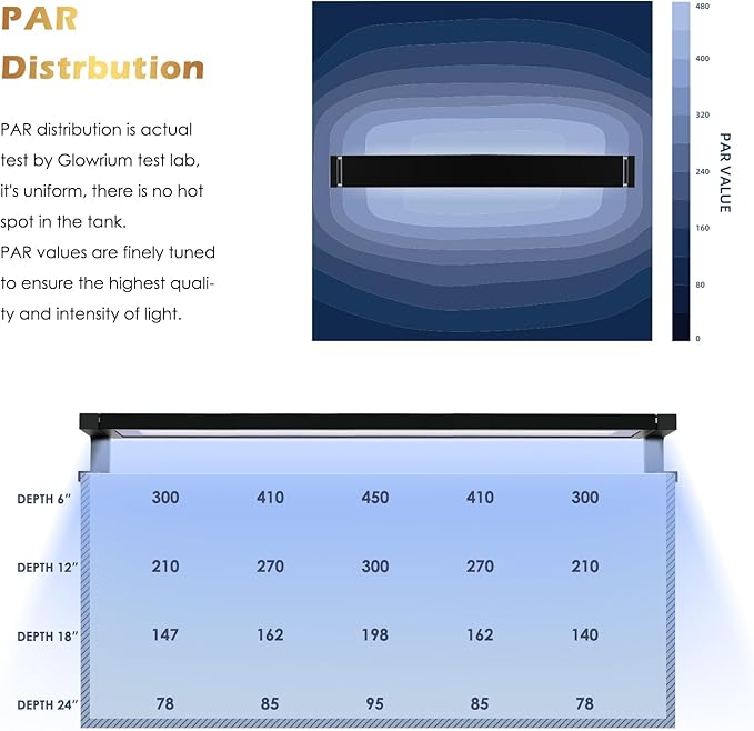 - 【DIY Spectrum and Brightness】Marine Aquarium light features 3 customize spectrum and 0-100% brightness adjustment, allowing you to freely adjust the intensity of each channel and set up your own spectrum for your corals. The marine light ensures precise lighting for optimal growth and health of your corals and fish.