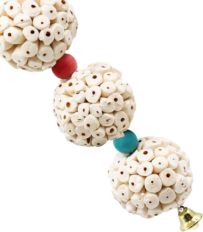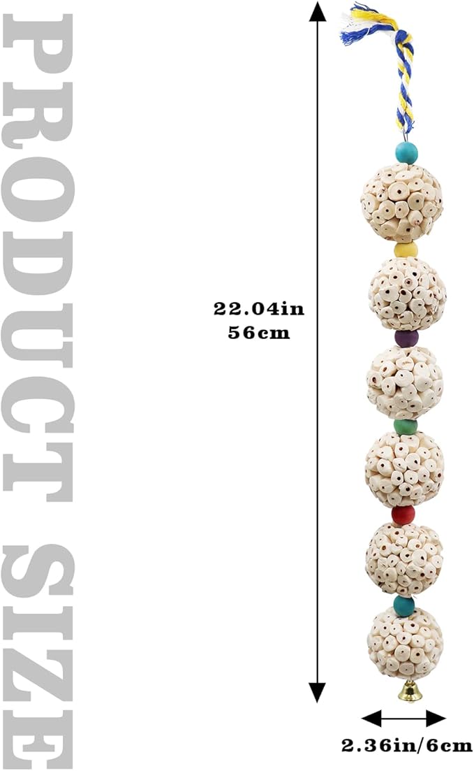 - Colorful and Auditory Delight: Each parrot chewing toy string comprises 6 sola balls separated by colorful wooden beads. At the bottom, a metal bell adds an auditory element, creating a pleasant sound when the bird indulges in chewing—an enticing and multi-sensory experience.