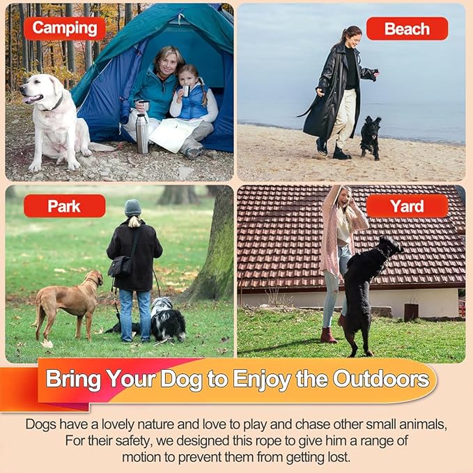 - 【Ease of Use & Wide Application】Simply attach one hook to your dog’s collar and wrap the other end around a post, tree, or even tie it to your waist for hands-free control. Ideal for camping, parks, yards, and gardens, this tie-out cable allows you to keep your pet safe during outdoor activities, giving you peace of mind while they explore.