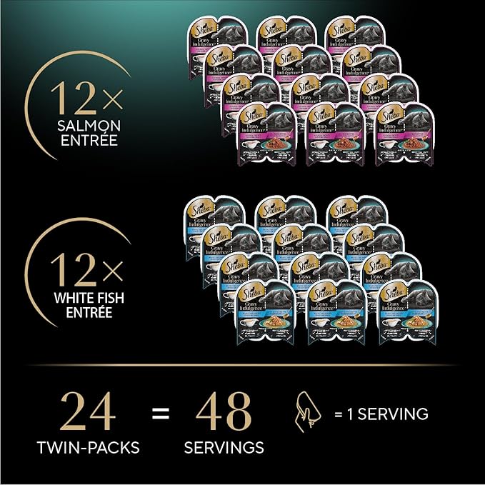 Sheba Gravy Indulgence Adult Wet Cat Food Salmon Entree and Whitefish Entree in Extra Gravy Variety Pack, 2.6 oz. Twin-Pack Trays, (12 Count, 24 Servings) (Pack of 2)