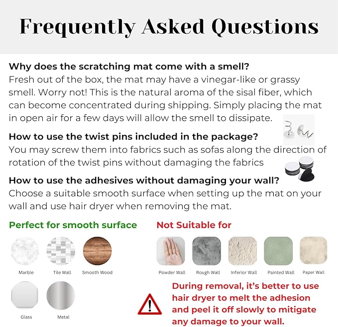 - Shedding-resistant Material for Less Mess, More Comfort: Reduce shedding and mess with our natural sisal material. Provide your cat with a safe and comfortable scratching surface that doesn't create a mess. Keep your home looking and feeling fresh with our shedding-resistant cat scratcher mat.
