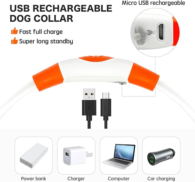 - ★Efficient and Convenient Lighting for Your Pet with the Rechargeable LED Dog Collar: The LED Dog Collar features multiple flash modes, including steady glow, quick flash, slow flash, and off, offering versatile use. The collar light is conveniently recharged with a mini USB cable after use, making it an energy-saving and convenient option for your pet's nighttime adventures.