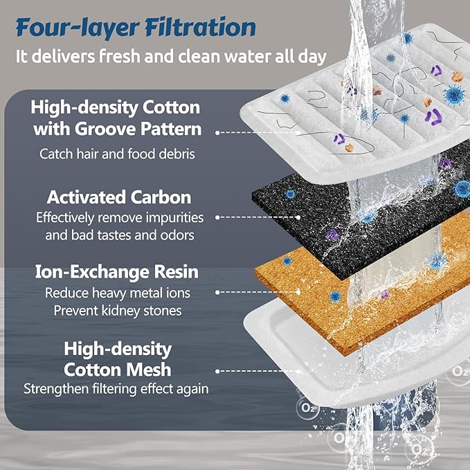 - đ˝ăDual Filtration SystemăORSDA cat fountain filters with 4-layers filtration- activated carbon, ion resin, double high-density ripple pattern cotton mesh, which can effectively filter out impurities, eliminate odors, combination with black pump sponges strengthen filter effect, delivering fresh and clean water 24/7 constantly.