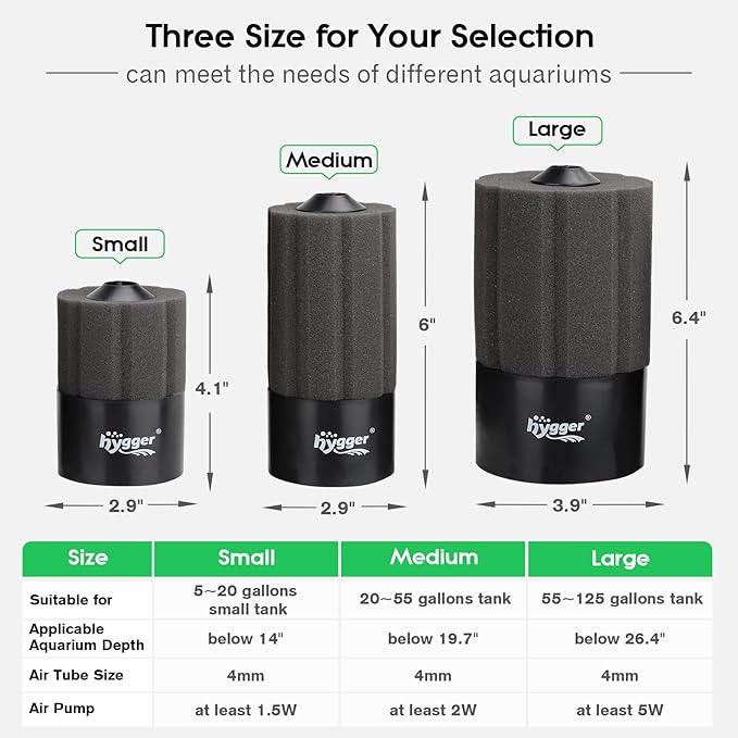 - Three Size For Choice: Small: 2.9"W x 4.1"H, it works pretty well filtration for 5 to 20 gallon small aquariums with under 14” depth. Medium: 2.9"W x 6"H, suggested for 20 to 55 gallon medium-sized aquariums with under 19.7” depth. Large: 3.9"W x 6.4"H, suggested for 55 to 125 gallon aquariums with under 26.4” depth