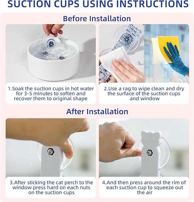 - Strong Suction Cups&More Stable:This cat window perch suction is installed by sticking the suction cups to the glass. It can be firmly mounted on window by 4 suction cups with strong suction power that are enlarged the diameter: 3.3 inches. A DIY ladder consists of 2~3 hammocks is suitable for cats who love to climb