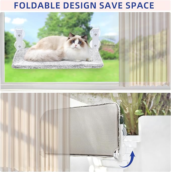 pettycare Cat Window Perch, Cordless Cat Window Hammock Bed with 4 Strong Suction Cups, Foldable Kitten Balcony Seat for Inside Hold Up to 40lbs, Solid Metal Frame and Soft Reversible 2 Fabrics Cover