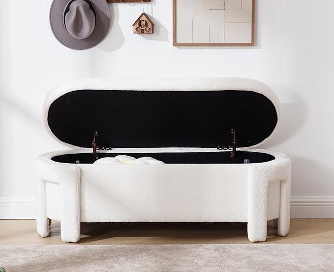 Kmax 50" Storage Ottoman Bench Modern Faux Fur Boucle Entryway Bench Comfy Upholstered End of Bed Bench for Hallway Entrance Bedroom Corner, White