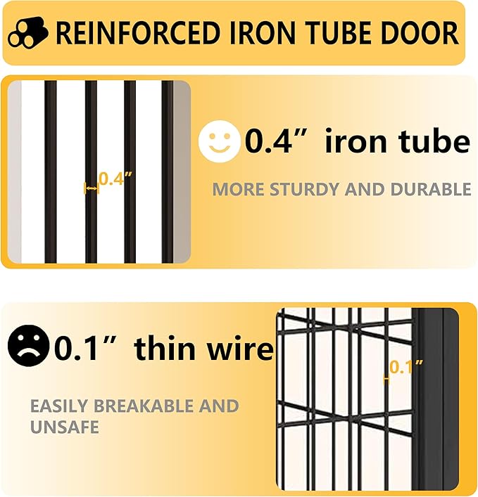 - 🐱【Sturdy and Durable】Heavy Duty Dog Crate is made of durable particle board and 0.4-inch thick iron pipe, sturdy construction can provide your dog with a durable, stable and safe place to rest, keeping it safe even during enthusiasm moments of play. Don't hesitate to give your dog a perfect home!!!!