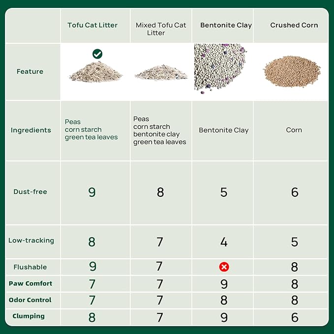 - 20% of the tofu cat litter is made from natural green tea leaves, peas, and corn starch, with a diameter of 3.0mm.