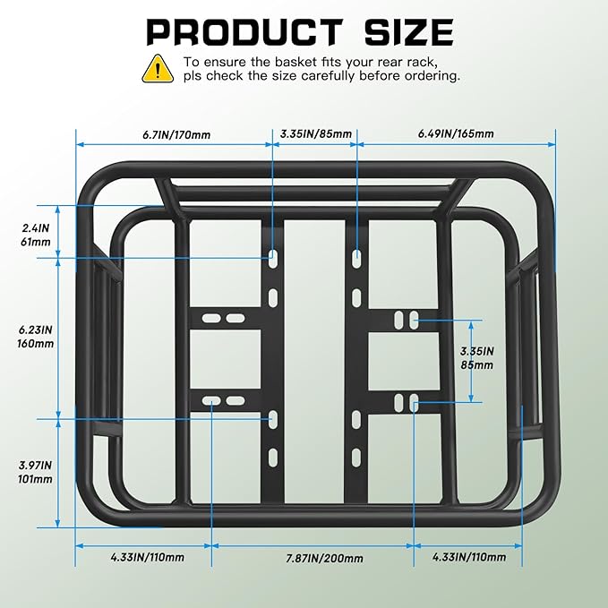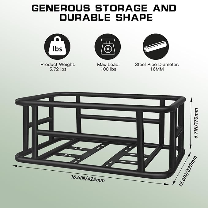 - ๐ฆ๐๐ฝ๐ฒ๐ฟ ๐๐ฎ๐ฟ๐ด๐ฒ ๐ฆ๐ฝ๐ฎ๐ฐ๐ฒ: The dimension of the basket is 16.6 x 12.6 x 6.7 inches, which can support a weight of 100lbs. Perfect for carrying backpacks๏ผpets๏ผdaily shopping, or as a delivery bike basket.