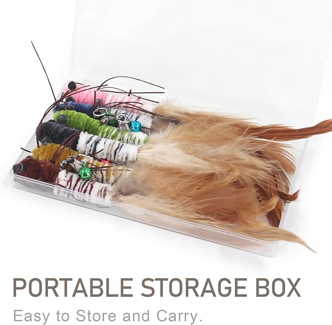 - [EASY STORAGE AND COMPATIBLE] All the cat toy wand refills were in a storage box, which is very practical. You can also use it to store similar small items. Each cat feather toy replacement is equipped with a clasp that works with any cat rod with an eyelet hook connector. It can also be hung to any place you want for your cat to play with, bring more play options and fun to cats.