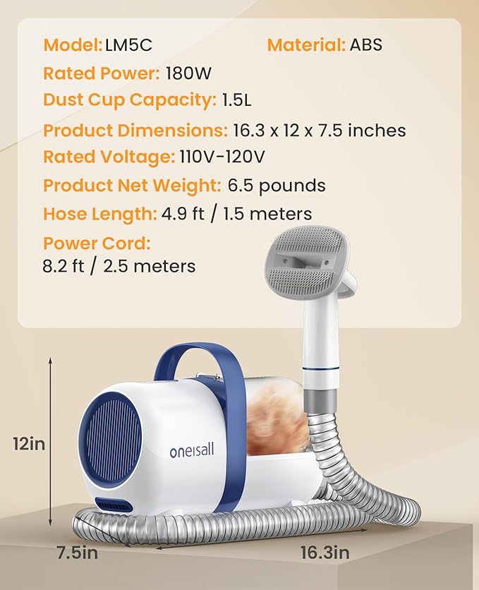 - Grooming & Vacuuming All-in-one:oneisall pet grooming vacuum for cats works with 110V-120V(50/60Hz) can collects 99% of pet hair. The removed & clipped loose hair will be sucked into the vacuum dust box directly when grooming pet hair, keep your home clean. Even if you are a newer, also can easily complete home grooming for cat