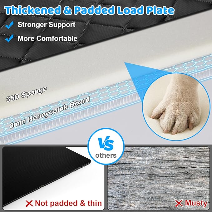 - Hard Bottom & Non-Slip Blanket: The dog car seat cover comes with thick hard bottom and anti-skid blanket that extends the backseat into a comfortable dog car bed. The back seat extender provides your dogs with maximum space and strong support up to 400 lbs, allowing them to lay down comfortably during long car rides. The non-slip blanket keeps dog in place, preventing dangerous sliding during sudden brakes