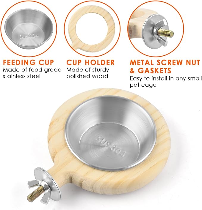 - FEEDING CUP & PERCH: KATUMO bird food bowl and wooded perch holder are combined in one, suitable for parakeet, canary, conure, lovebird, budgie and more small pets.