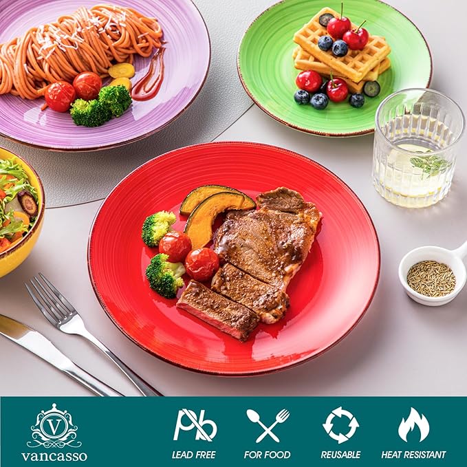 - 【Exquisite Spiral Design】The Bonita colorful bowls and plates set features a captivating spiral pattern, adding an artistic touch to your table. This dishes set for 4 stands out with its eye-catching design and vibrant colors.