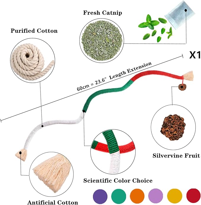 - 1. [Mix-Cat Toys for Meet all Needs]:Interactive catnip indoor toys can effectively enhance your cats' physical & mental health.package included: 1*catnip bag + 1*23.6”Cat catnip rope toys + 1*cat silvervine stick with lafite grass + 1*cat silvervine stick with black feather.the cat chew toys for indoor cats is suitable for cats of all ages & breeds, fun and relaxation for every stage of life. No wire inside, safe to use