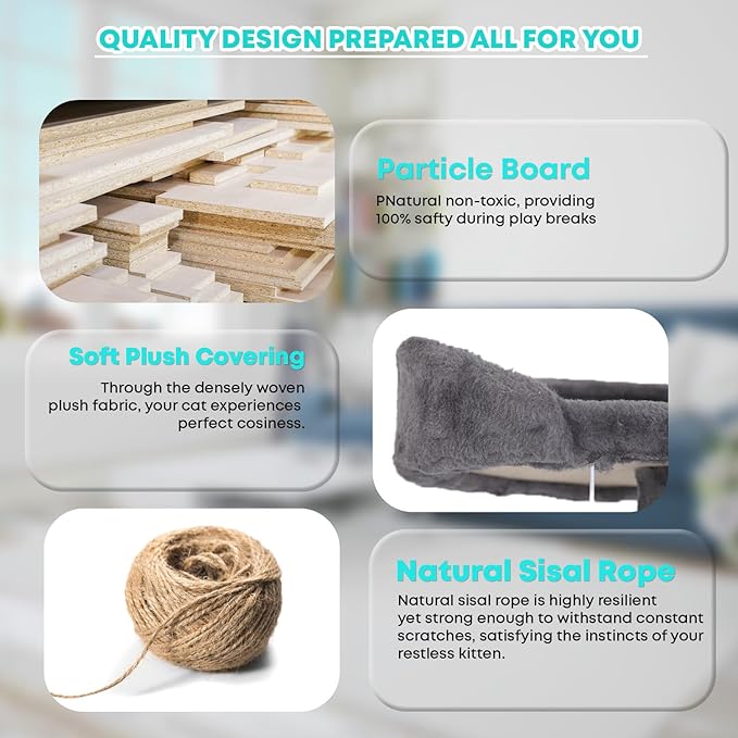 - 🐱 【Posts for Scratching Covered in Sisal 】These are scratching surfaces that are integrated into the framework. Cats love to bury their claws in sisal because it's a sturdy substance with a coarse texture. Our cat tree promotes healthy scratching habits and helps discourage cats from damaging furniture by offering dedicated spaces for them to scratch.