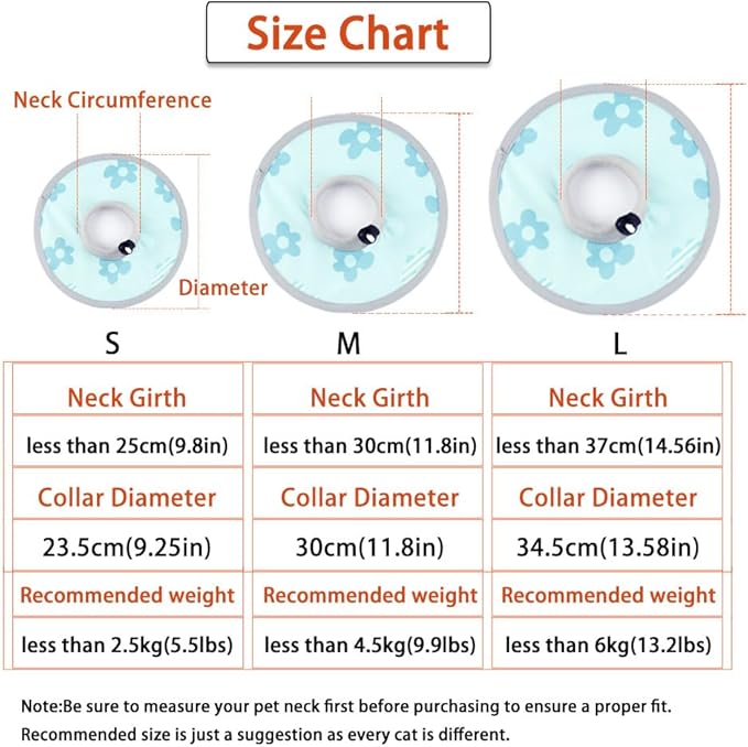 - Size:S,Neck Circumference:less than 9.8in, Recommended weight:less than 5.5lbs, Collar Diameter:9.25in, M,Neck Circumference: less than 11.8in, Recommended weight: less than 9.9lbs, Collar Diameter:11.8in, L,Neck Circumference:less than 14.56in, Recommended weight:less than 13.2lbs, Collar Diameter:13.58in