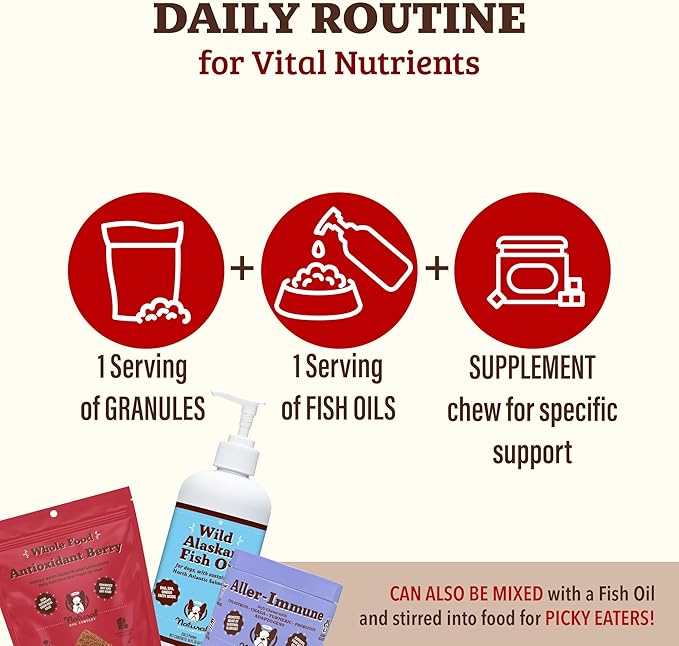 - COMPLETE NUTRITION FOR YOUR DOG'S WELLNESS: For a truly comprehensive approach, combine with our Ultra Omega Oil and Skin & Coat Chews to create a full-spectrum diet regimen that nourishes skin, promotes a shiny, healthy coat, and supports immune function, joint health, and cognitive well-being.