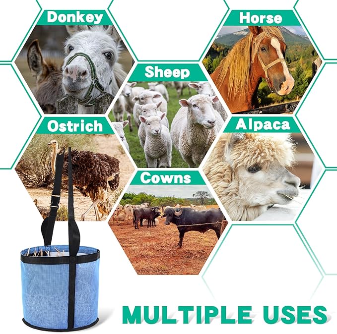 - Portable and Easy to Carry: the mesh feed bucket with adjustable strap is compact and lightweight, portable to carry, folding easily when not in use, suitable for overnight trips, weekend camping, or individual feeding at home