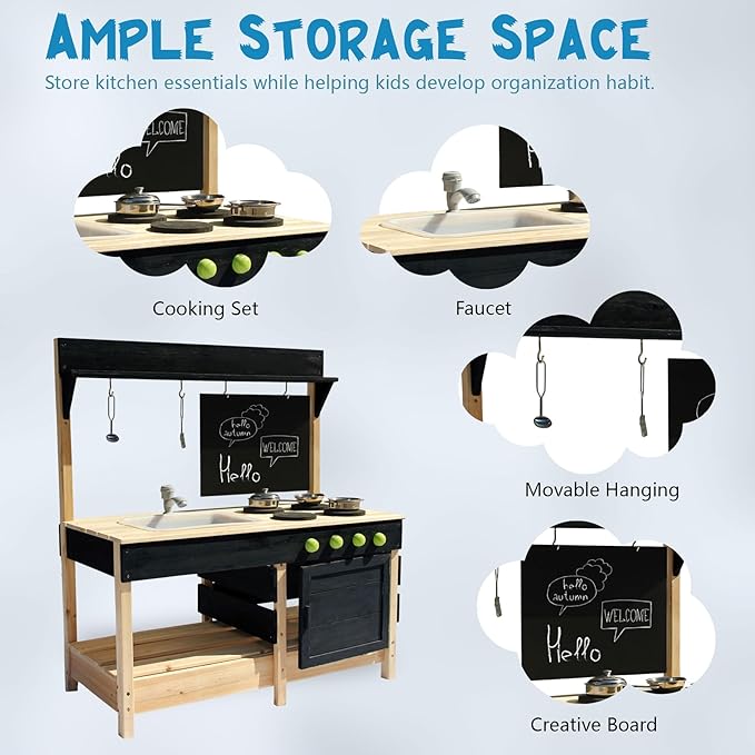 - Ultimate Playtime Fun: Our deluxe mud kitchen is bursting with features to spark children's imaginations. Complete with a working water tap, four stoves with turnable knobs, a BBQ grill, removable sink, blackboard, and cookware accessories, kids will dive into imaginative kitchen play right away.