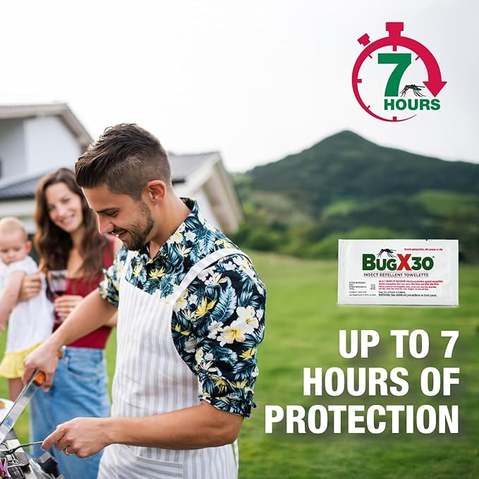 - UP TO 7 HOURS OF PROTECTION - Our Travel Size Insect Repellent Wipes contain 30% DEET and will keep you protected from a wide array of pesky insects for up to 7 hours after application. Bug X 30 is a powerful mosquito repellent & tick repellent