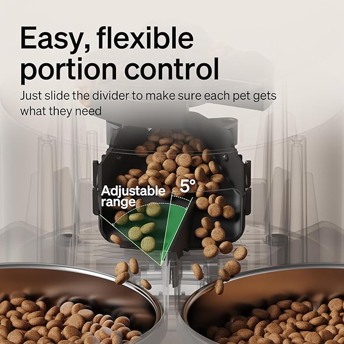- ADJUSTABLE FOOD DISTRIBUTION: Customize the portion size for each bowl of the PETLIBRO wifi automatic cat feeder through the app's mode settings and the rotatable meal splitter. Tailor feeding to suit multi-pet families' needs.