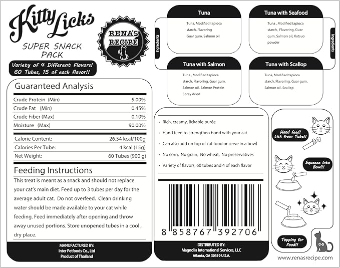 Rena's Recipe Kitty Licks Tuna Barrel (60 Tubes) 4 flavorsX 15 Tubes Cream Lickable Cat Treats 4 Different Flavors: Tuna with Seafood, Scallop, and Salmon