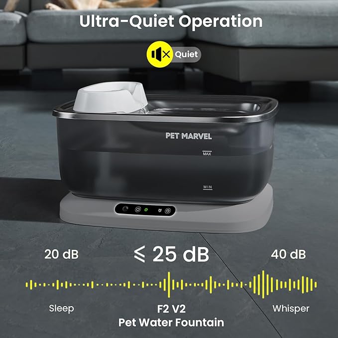 - SUPER QUIET & SAFE WATER PUMP: The dog water dispenser is equipped with a safe wireless pump, when the water level is too low, the orange indicator light will also lift the water water level is too low, the pump will automatically stop to prevent dry burning. The transparent water tank is equally easy to monitor. It operates at less than 25 decibels to create a quiet environment for pet owners and their furry companions, perfect for those who are sensitive to noise