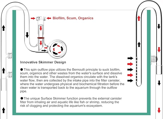 - Innovative Spin Outflow Pipe with Surface Skimmer Design: The unique Surface Skimmer function prevents the external canister filter from inhaling air and aquatic life like fish or shrimp, reducing the risk of clogging and protecting the aquarium's ecosystem. Spin outflow pipe creates a circling flow of water inside its loop section, and slows the speed of water flow.