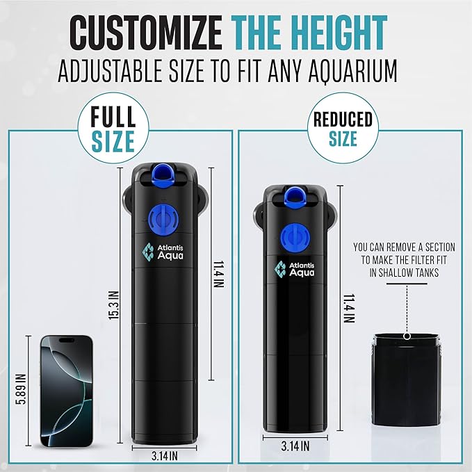 - ALL-IN-ONE FILTRATION SYSTEM β Our submersible fish tank filter includes a sponge filter and a biological filter. The filter is 15.3" tall and 3.14" wide but it can be used with one section removed and is 11.4" tall.