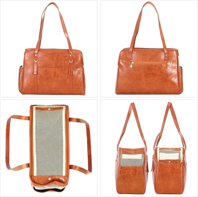 Dog Carrier Purse, Fashion Leather Pet Carrier with Pockets, Airline Approved Soft Sided Dog Carrying Bag for Puppy Cat Dog Brown