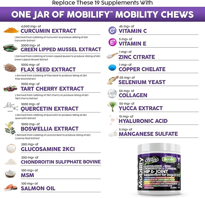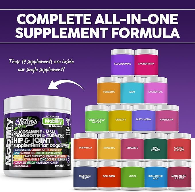 - Joint Support Supplement For Dogs:Formulated to support mobility for dogs and aid in reducing dog joint pain. Key ingredients like glucosamine and chondroitin for dogs work synergistically to ease dog joint pain relief. Our joint supplements for dogs comes in beef flavoring making it easy to give as a soft dog treats or in a pill pockets for dogs. Hip and joint chews for dogs also work as a pain reliever with the addition of omega 3 fish oil, dog vitamin e supplement and turmeric curcumin supplement.