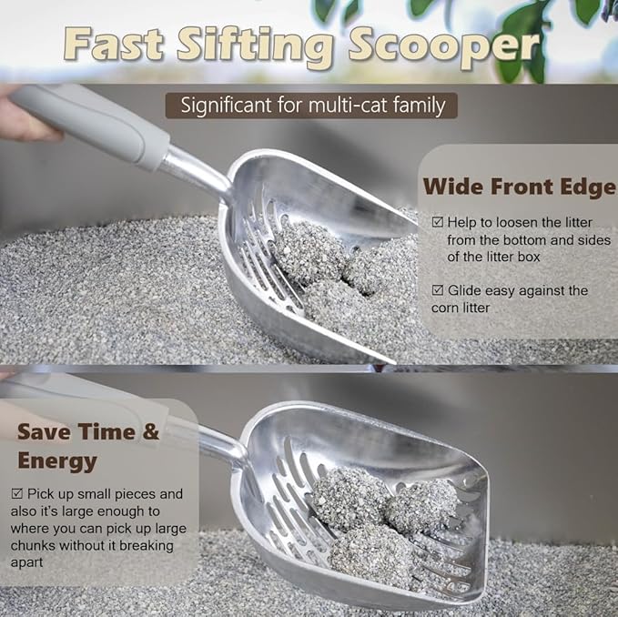 - FAST SIFTING & CLEAN FLOOR - The optimal spacing of the scooper ensures a minimal shaking that allows more usable cat litter to pass through. The scoop holder keeps your floor tidy from unwanted messes and dust dropping from litter scooper