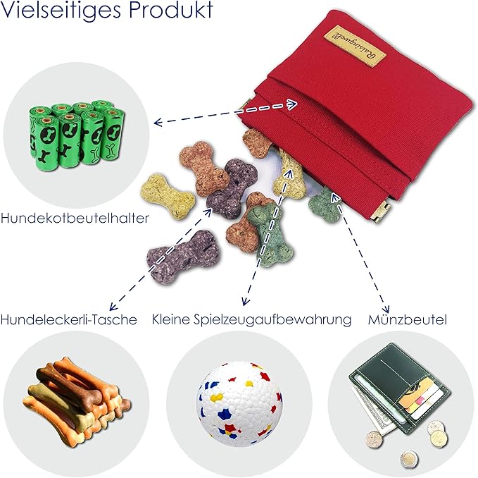 Dog Treat Pouch, Red Pocket Sized Pet Training Pouch, Cotton Fabric, Hand Free Dog Walking Bag with Carabiner, Self-Closing Pet Feed Snack Reward, for Puppy Travel or Outdoor Use