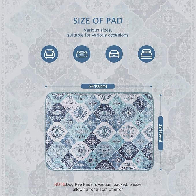 - 【Fashionable and Non-Slip】Our bohemian-print design adds a natural touch to the potty pads for dogs, giving your room a warm, casual vibe. And the non-slip bottom design makes the pet pee pads can achieve a certain fixed effect, you can put it anywhere you want. Soft and non-slip material makes it safer for dogs to use the pads.