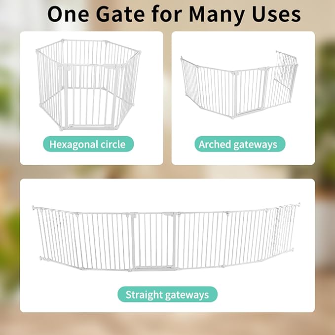 - 【MULTI-PURPOSE FIREPLACE BABY GATE】Great for wide spaces, angled openings, hallway, doorway, or bottom of stairs; It can be used as a freestanding panel gate for dogs when you set it up as a circular enclosure; It can be installed as a freestanding Playpen for your kids. Also suitable to use around fireplaces, grills, wood-burning stoves, Christmas trees, etc.