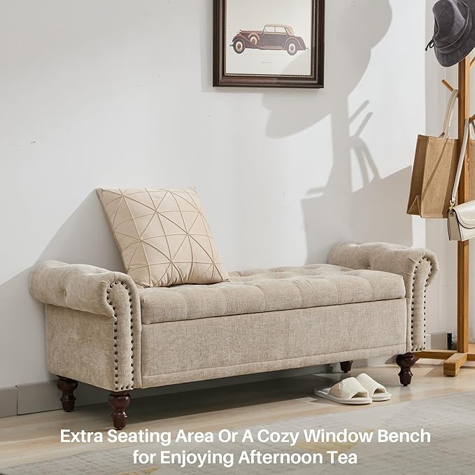 58.1'' Storage Bench Upholstered Chenille End of Bedroom Bed Bench Ottoman with Tufted Cushioned Rolled Arm Large Storage Space for Reading Living Room Entryway, Light Brown