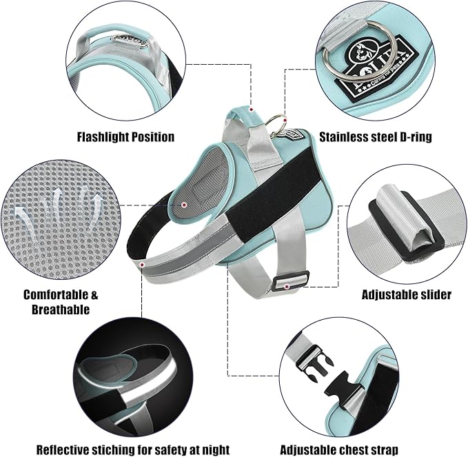 - OUTDOOR HEALTHY: Puppy no pull dog harness with reflective straps to ensure your dog is highly visible and keep dogs safe at night. You can connect the dog leash on the D-ring and with handle is easy to control on crowded streets. The high-end pet harness is perfect for daily walking, running, hiking, training, hunting, outdoor adventure and more!