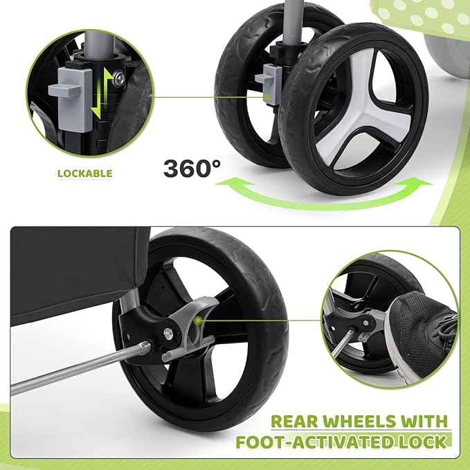 - Advanced Wheel Suspension, Braking & Safety System: Designed for stability, maneuverability, and control, our pet stroller features 360° swivel front wheels for effortless navigation, while the shock-absorbing rear wheels ensure a smooth, stable ride on various terrains. For added safety, the dual rear-wheel braking system provides a secure stop on slopes and uneven surfaces, giving pet owners peace of mind during strolls