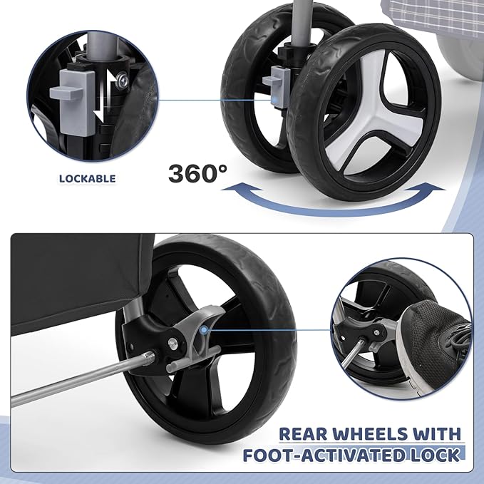 - Advanced Wheel Suspension, Braking & Safety System: Designed for stability, maneuverability, and control, our pet stroller features 360° swivel front wheels for effortless navigation, while the shock-absorbing rear wheels ensure a smooth, stable ride on various terrains. For added safety, the dual rear-wheel braking system provides a secure stop on slopes and uneven surfaces, giving pet owners peace of mind during strolls