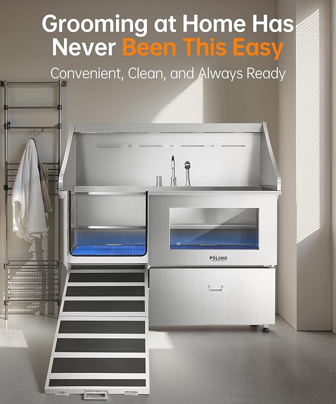 - Innovative and Practical Design: The POLIMO dog grooming station features multiple outstanding design elements: ① IP65 Waterproof high-brightness LED spotlight. ② Grade A tempered glass observation window. ③ The bathtub’s side panels feature a curved slide design, making it easier to operate④ Two-piece floor grid, adjustable to three different heights. ⑤ Sliding storage drawer for organized storage. ⑥ Multi-function faucet and showerhead, adjustable to left, center, or right positions.⑦ Two drainage options are available: one with a pet hair catcher and another stainless steel drain pipe featuring an odor-blocking S-trap design