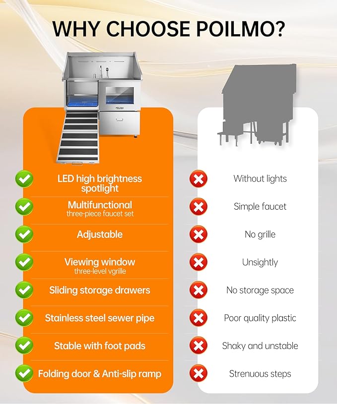 - Innovative and Practical Design: The POLIMO dog grooming station features multiple outstanding design elements: ① IP65 Waterproof high-brightness LED spotlight. ② Grade A tempered glass observation window. ③ The bathtub’s side panels feature a curved slide design, making it easier to operate④ Two-piece floor grid, adjustable to three different heights. ⑤ Sliding storage drawer for organized storage. ⑥ Multi-function faucet and showerhead, adjustable to left, center, or right positions.⑦ Two drainage options are available: one with a pet hair catcher and another stainless steel drain pipe featuring an odor-blocking S-trap design